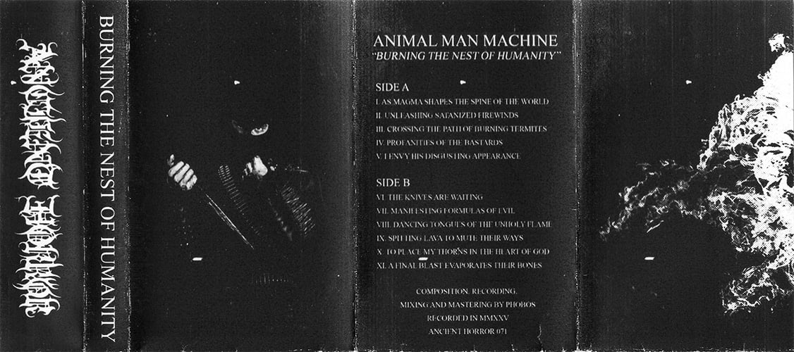 The long-awaited second full-length album from Hellenic Black Metal entity Animal Man Machine, titled Burning the Nest of Humanity. Released once again under Ancient Horror banner, this marks our third collaboration with the band since 2020, beginning with their appearance on catalog 003, followed by their first full-length on catalog 008 in 2021. A matured offering that keeps the same intensity and spirit as its predecessors, further stoking the ever-burning black flame that fuels the band's vision.