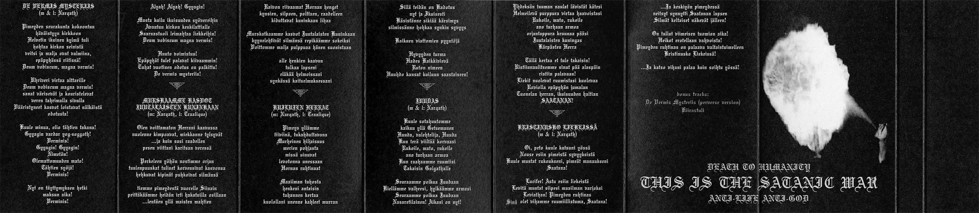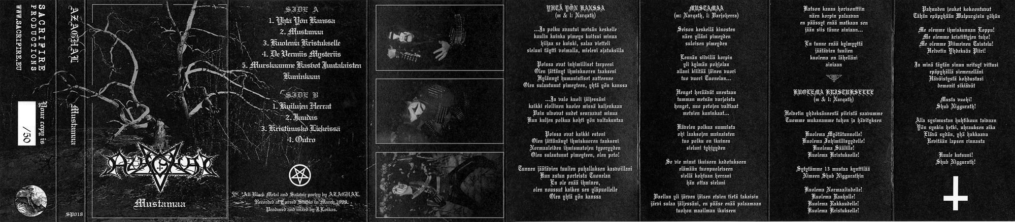 The original version of “Mustamaa” album, including two bonus tracks. This is the version that was wholly recorded at Cursed Studio in 1999, but wasn’t released until the long sold-out CD back in 2011. Including two cassette only bonus tracks; De Vermis Mysteriis (perverse version) and Kiirastuli.