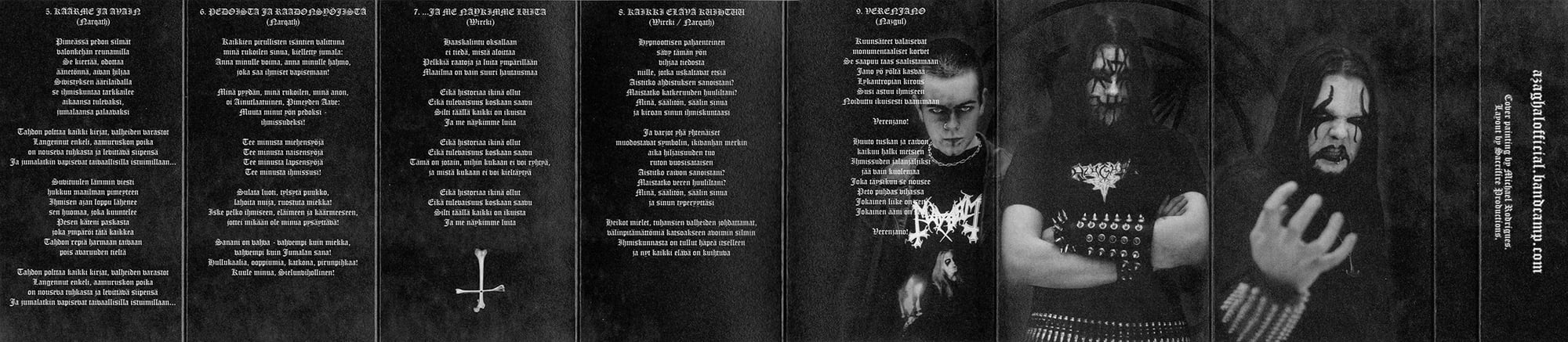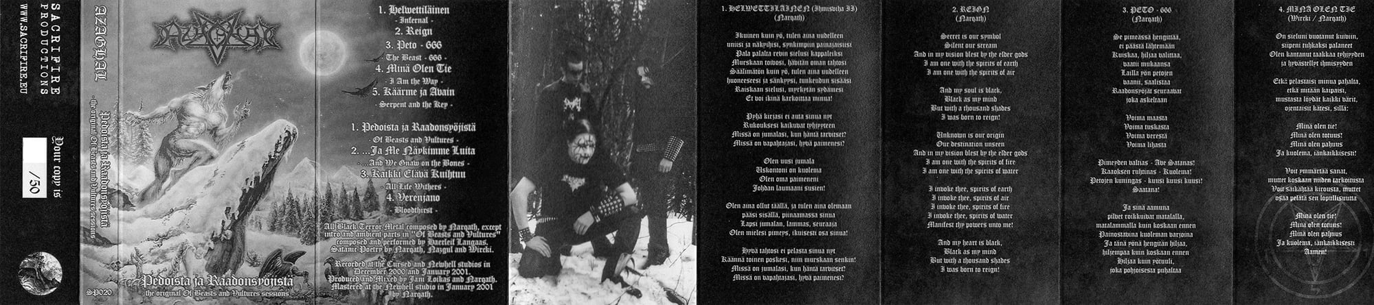 The original version of “Of Beasts and Vultures” album as it was meant to be released – now titled “Pedoista ja Raadonsyöjistä”. Most of the tracks were scattered on various split and compilation records, and this version of the album was never released as a whole. Once again, we at Sacrifire Productions are here to right one wrong and release this magnificent beast as it was supposed to be. Nine tracks of much rawer Black Metal than what was released as the Of Beasts and Vultures album in 2001 by Evil Horde Records. Yet again, this release will be available as a limited tape and digital download.