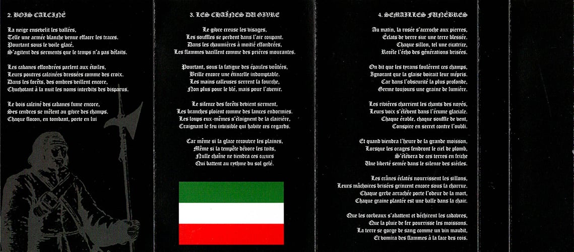 Debut demo by this new horde of mighty Québecois BM. Highly melodic, triumphant Black Metal, inspired by the likes of Monarque, Forteresse, Absurd, and Oi! music, particularly in the leads and martial rhythms of the first tracks. Songs of timeless nostalgia and deep connection to tradition and a land defiled by parasitism.