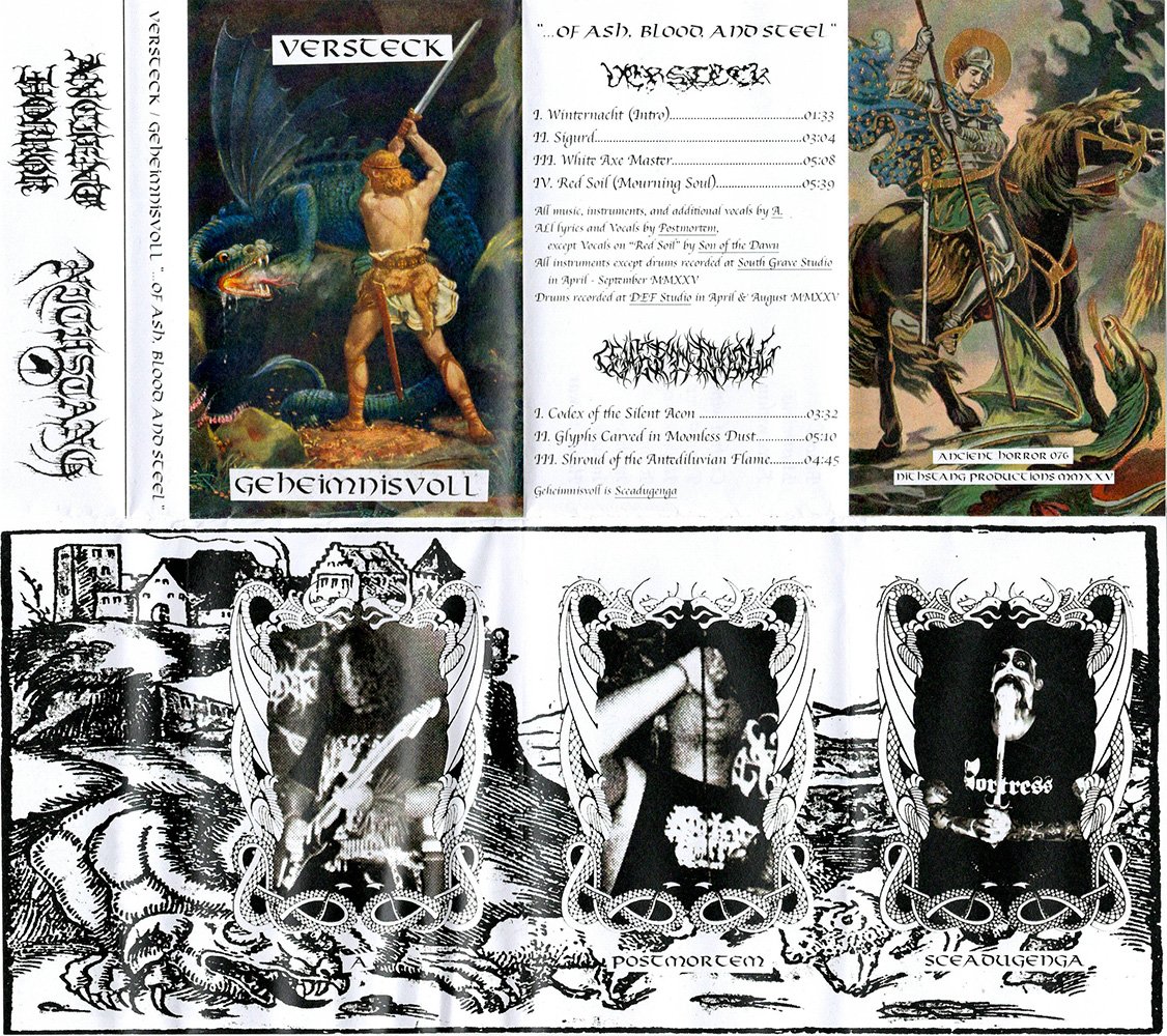 Brilliant split between these two hordes that should be known to most following the dedicated underground in recent years. A. and Postmortem deliver another great release with Versteck. One of the most surprising Black Punk acts in recent years, combining elements of European Black Metal stoic romanticism with the vileness unforgivingness of Bone Awl and Ødelegger unleash here 4 more tracks of Pagan barbarism. Geheimnisvoll of the ever prolific Sceadugenga unveils 3 tracks of ablaze, nocturnal Black Metal, honoring the hordes of Tampere and the French Concilium with the ever frantic, energetic, deathly pulse that characterizes his sound and his american peers.